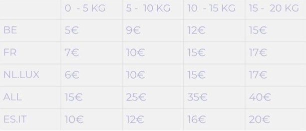 All orders placed on this website are subject to fixed shipping rates. Shipping costs are determined based on the destination and the weight of the package, according to the fixed rate grid below. These rates are applied automatically at checkout.